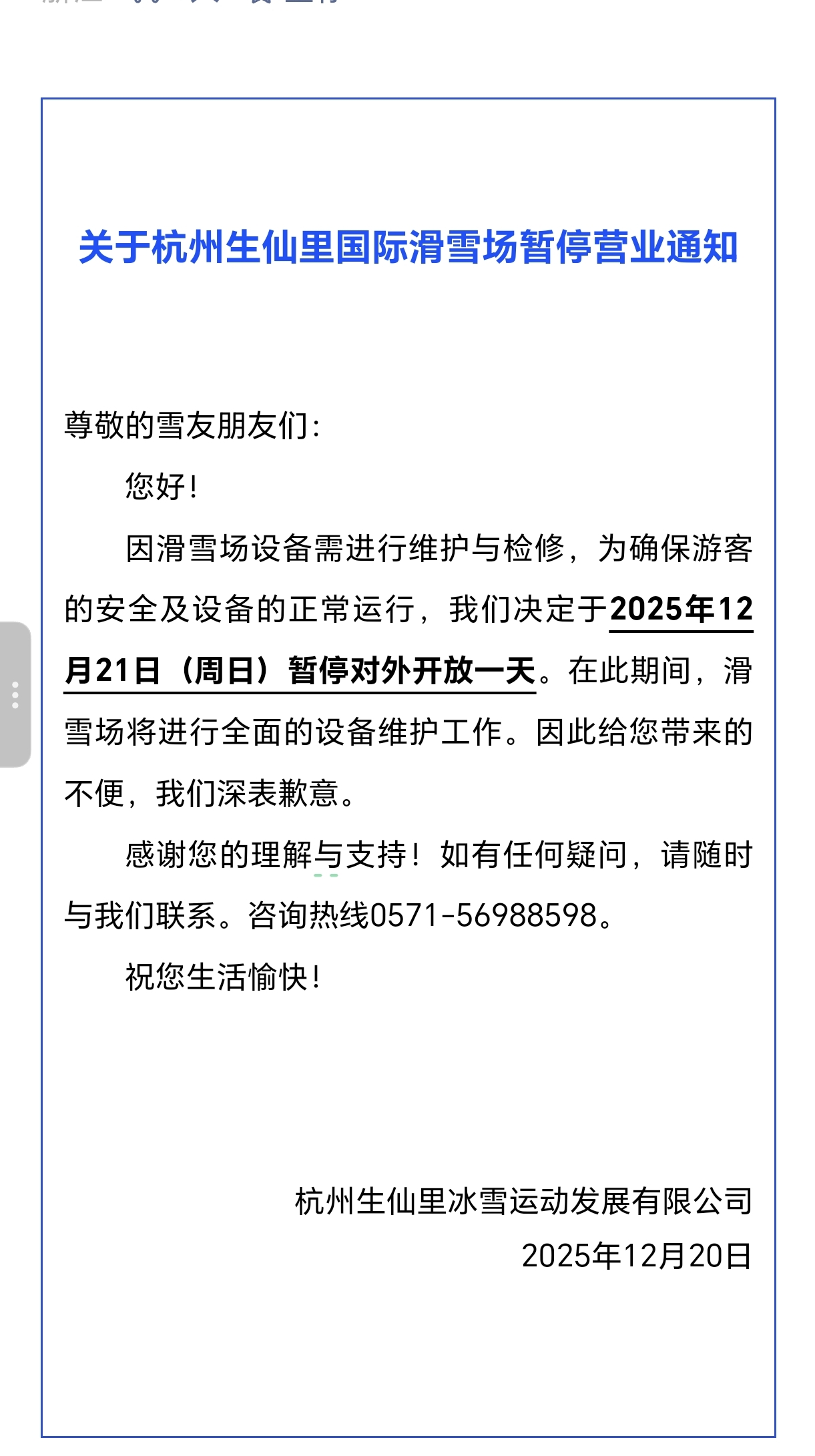 20日晚10时许,杭州生仙里海外滑雪场发布见告,因滑雪场竖立需检会和惊羡,于12月21日暂停对外绽开一天。