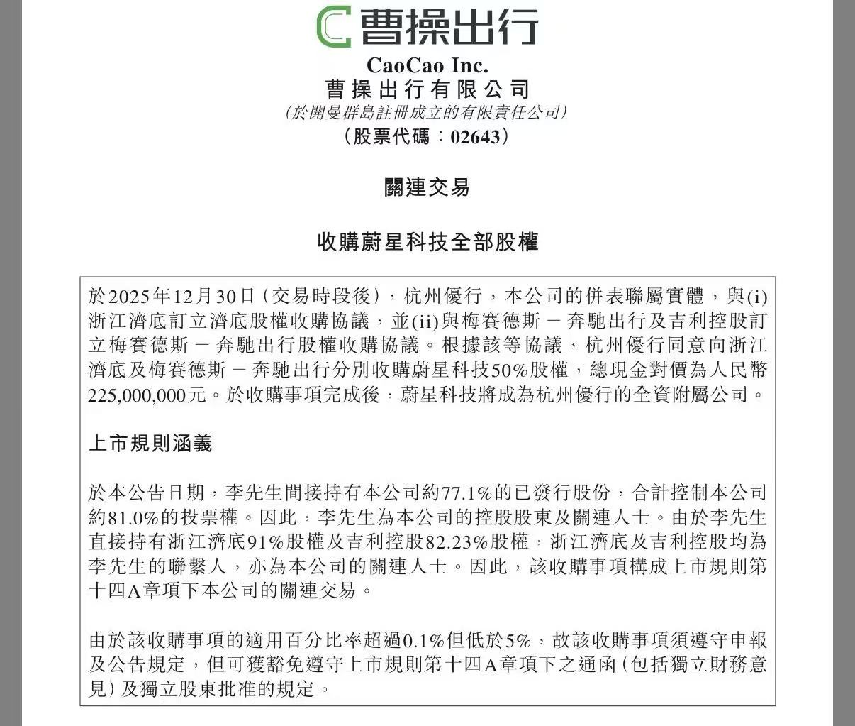 12月30日,曹操出行发布公告称,公司决定收购蔚星科技有限公司(耀出行)100%股权,总现款对价为东谈主民币2.25亿元。于收购事项完成后,蔚星科技将成为杭州优行的全资从属公司。