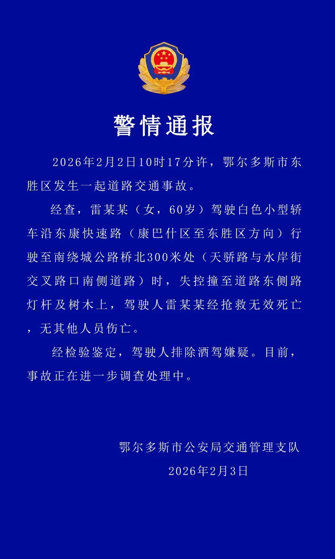 2026年2月2日10时17分许,鄂尔多斯市东胜区发生一皆说念路交通事故。经查,雷某某(女,60岁)驾驶白色微型轿车沿东康快速路(康巴什区至东胜区地方)行驶至南绕城公路桥北300米处(天骄路与水岸街交叉路口南侧说念路)时,失控撞至说念路东侧街灯杆及树木上,驾驶东说念主雷某某经抢救无效死字,无其他东说念主员伤一火。经考试决然,驾驶东说念主摈斥酒驾嫌疑。当今,事故正在进一步访问处理中。