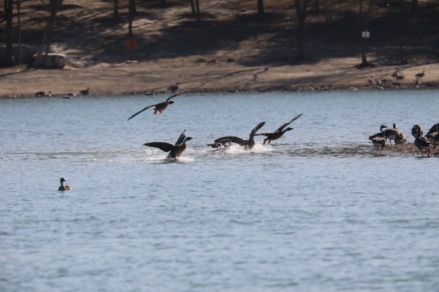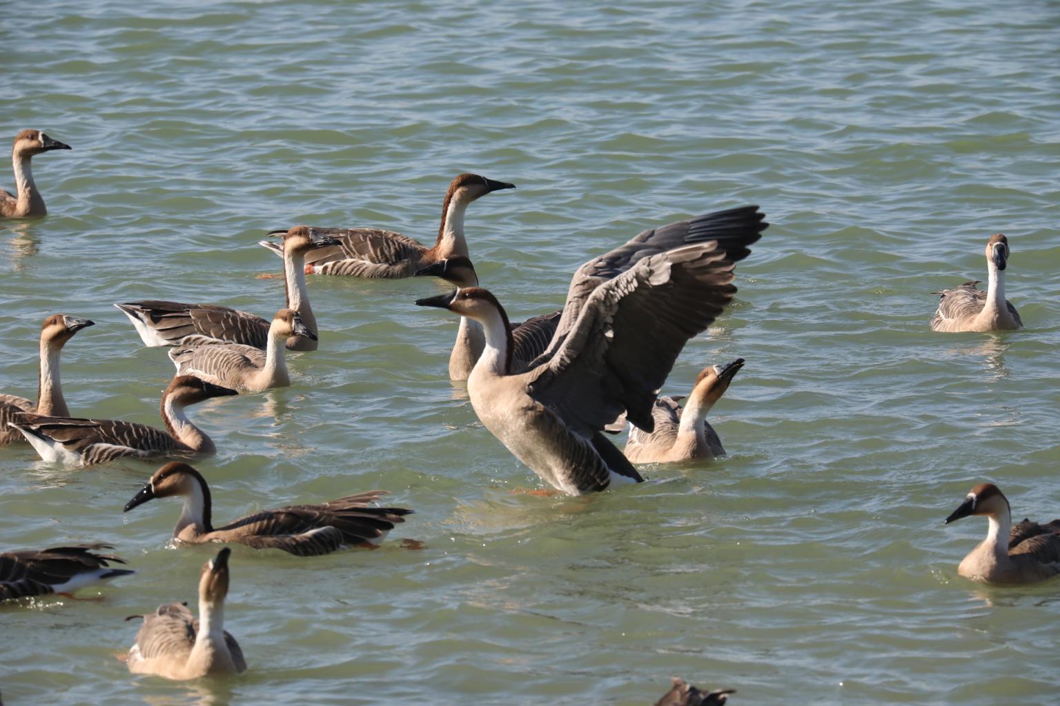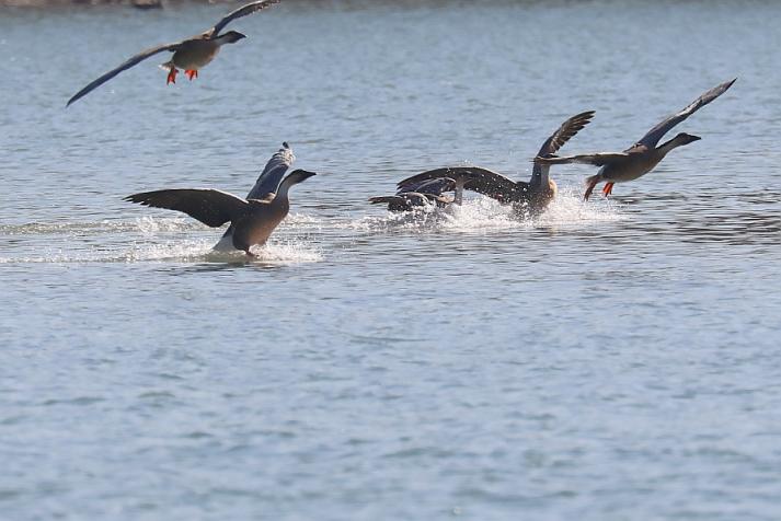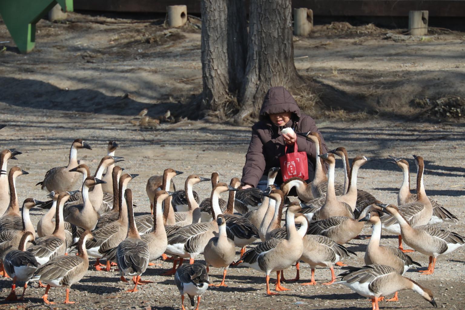 早晨的暖阳初升,雁鸣渐起。部分鸿雁栖息在湖心岛的芦苇丛中,看到游东谈主的到来后,不少胆大的游往岸边徬徨,与投喂的搭客仁爱互动。呈现出一幅东谈主与当然息争相处的画面。