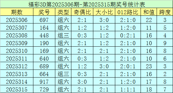 上期归来:福彩3D第2025315期开奖号码为729,组选类型为组六,奇偶比为2:1,大小比为2:1。