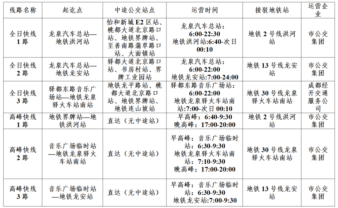 在地铁2号线东段暂停运营时间,成都将在暂停运营的6个地铁站点掌握新洞开10条公交快线,包含3条全日快线和7条岑岭快线,接驳地铁2号线洪河站、地铁13号线龙安站和地铁30号线龙泉驿火车站南站等站点。公交快线将于2025年12月16日至19日试开动,2025年12月20日起认真开动。同期,龙泉驿区还将按需优化调理、提频加密区内12条既有惯例公交澄清,强化与地铁多点接驳,增强停运区段一皆住户出行业绩。