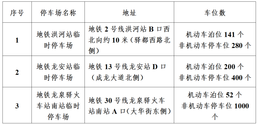 为方便市民自驾换乘地铁,地铁2号线洪河站、地铁30号线龙泉驿火车站南站、地铁13号线龙安站掌握新建3个泊车场(含393个纯真车位与1680个非纯真车位),停运时间,非纯真车泊车免费,纯真车泊车可享受半价优惠,业绩市民泊车换乘地铁出行。