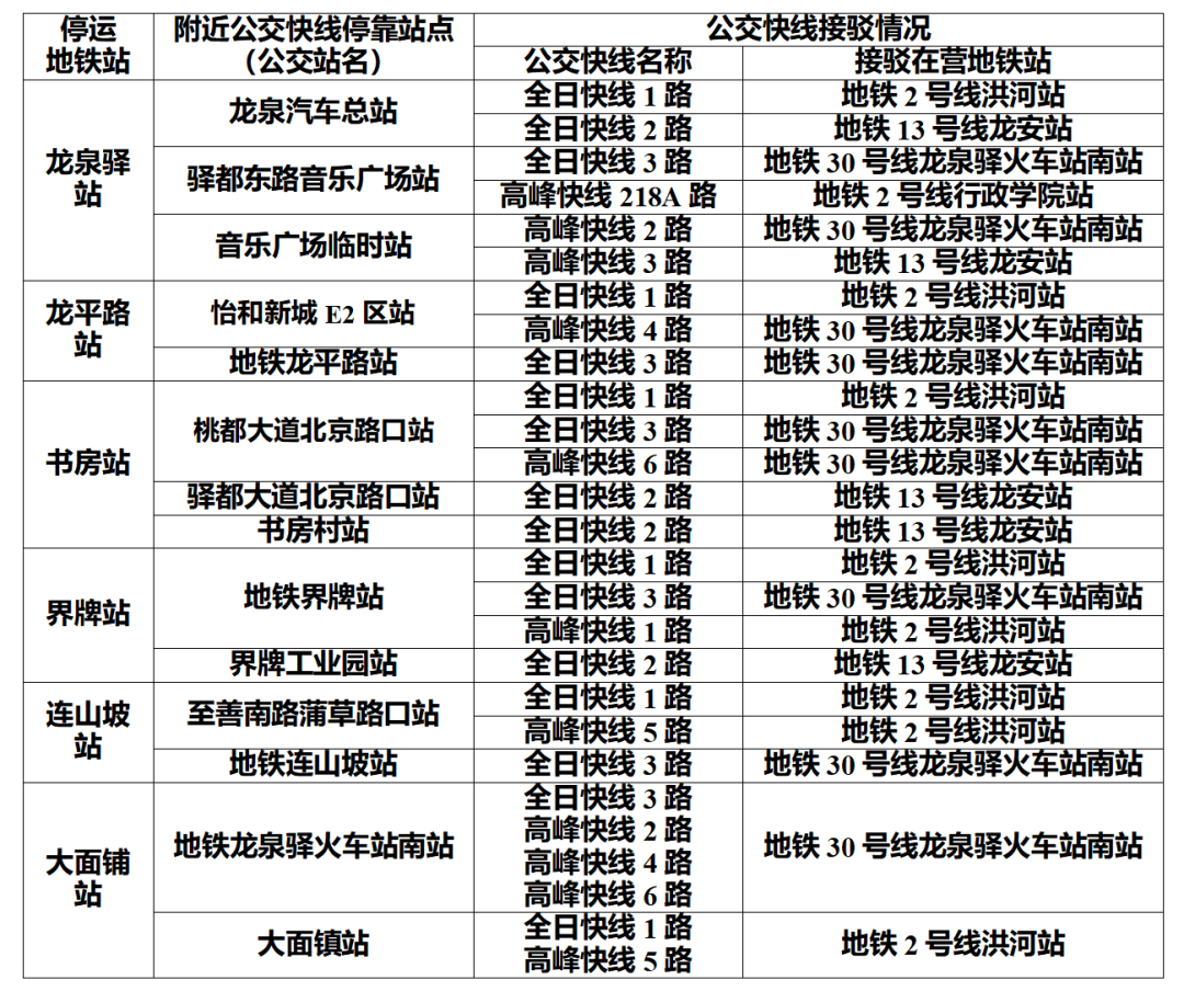 当今,每个停运地铁站掌握区域均开行了多条公交快线接驳至运营地铁站,龙泉驿片区市民可弃取就近搭车。成都公交后续将不息密切关怀客流出行特征,聚拢本色需求动态调理澄清发车频次、澄清走向、泊岸站点等。