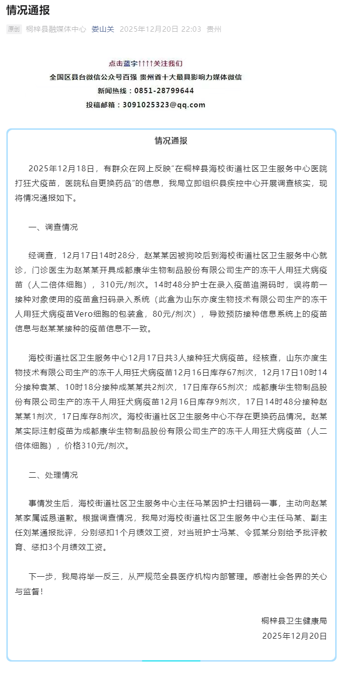 2025年12月18日,有世界在网上反应“在桐梓县海校街谈社区卫生做事中心病院打狂犬疫苗,病院背地更换药品”的信息,我局立即组织县疾控中心开展拜访核实,现将情况通报如下。